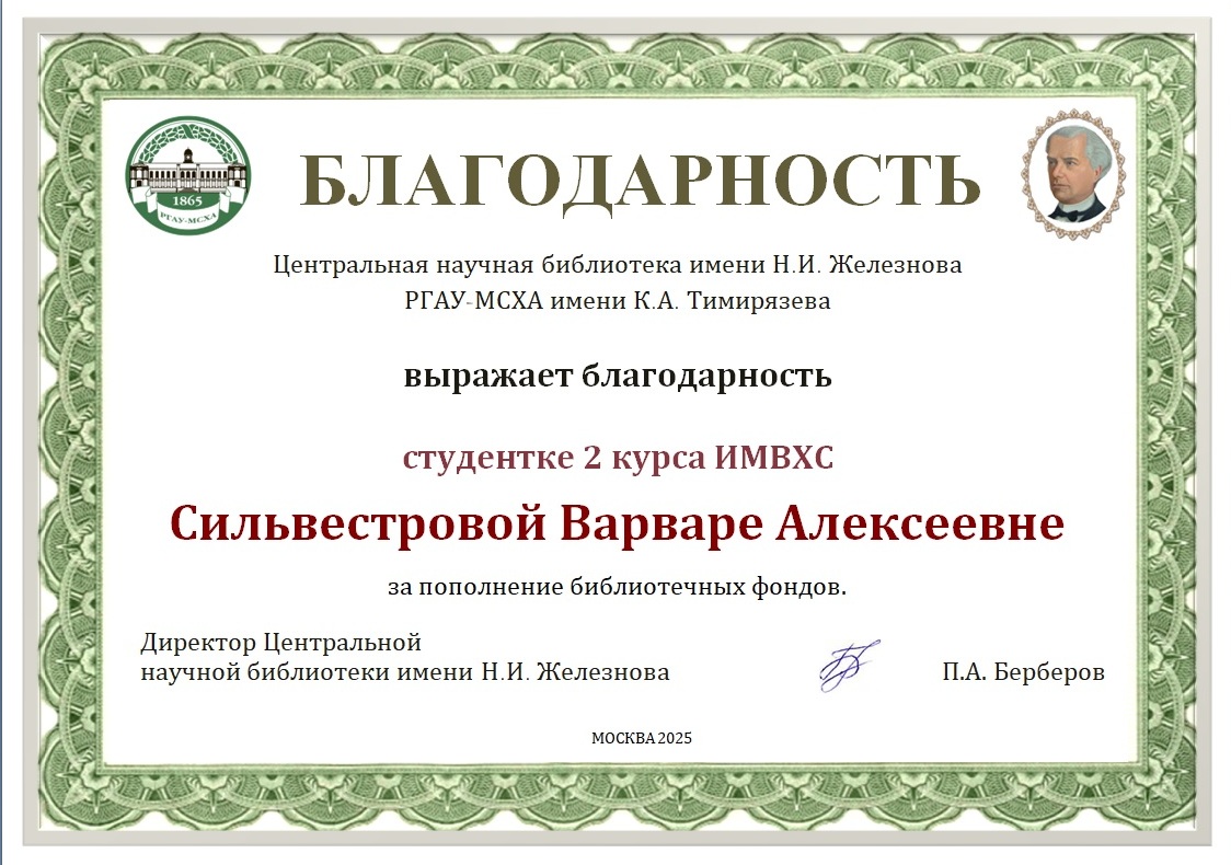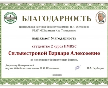 Центральная научная библиотека имени Н.И. Железнова выражает искреннюю благодарность и глубокую признательность студентке 2 курса ИМВХС Сильвестровой Варваре Алексеевне за пополнение библиотечных фондов.
