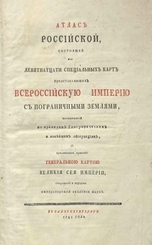 13 сентября 1745 года выходит в свет первое издание географического «Атласа Российского» в 19 картах. В него были включены съемки петровских геодезистов и географических исследований предшествующих лет.