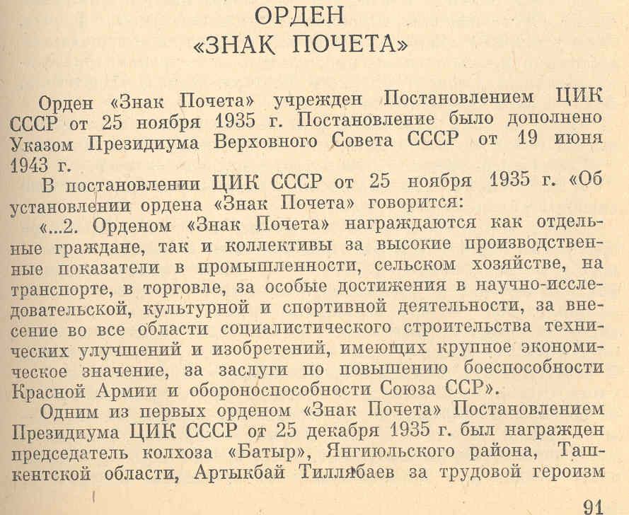 Одним из первых орденом «Знак Почета» был награжден председатель колхоза «Батыр» Ташкентской области Артыкбай Тиллябаев за трудовой героизм и успехи в деле поднятия урожайности по хлопку. Ему и вручен орден «Знак Почета» № 1. А первым коллективом, награжденным орденом «Знак Почета», стал мартеновский цех № 2 Макеевского металлургического завода имени С.М. Кирова. Коллектив был награжден за перевыполнение плана, хорошую организацию соревнования и досрочное выполнение важнейших государственных заданий.